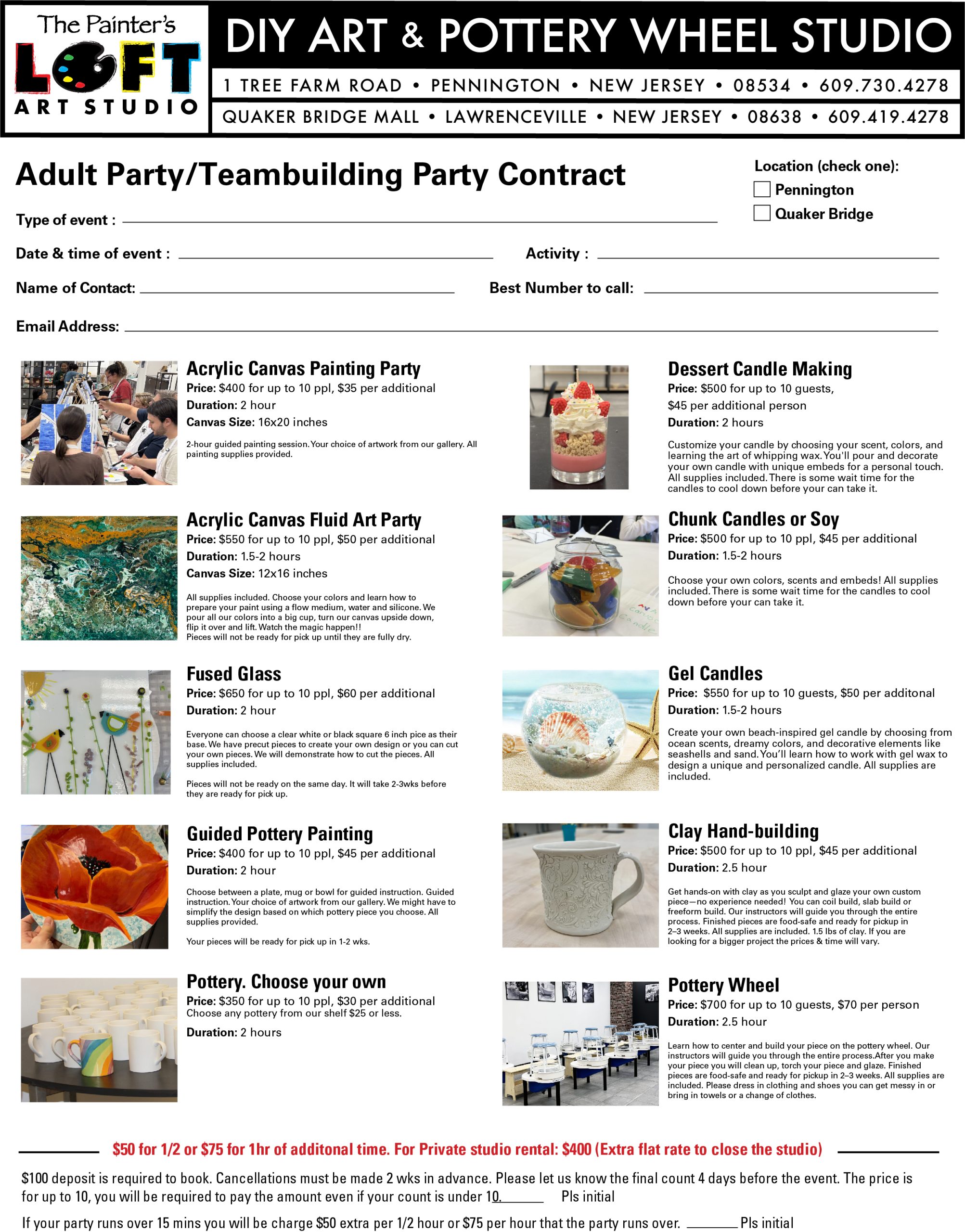 Events are fully customizable and BYOB is welcome. You can bring in your own food and drinks. We’ll help you make it memorable. We will provide you with a table for off and another for the activity. We have black tablecloths available but you can bring in your own. You would need to bring in your own supplies for food and drinks. The last 30 mins is left for food/cake/cupcakes. Our staff will guide the activity and clean up. You are responsible for the non activity part of the event. If you need additional help you can ask our staff for assistance. Tips are not necessary but appreciated.